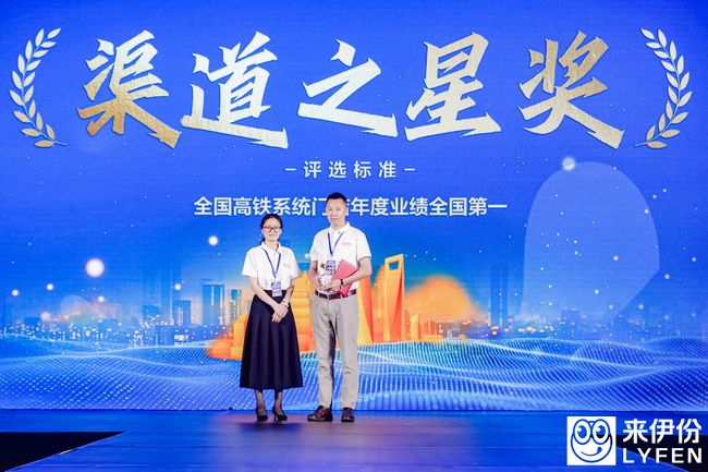 ▲高铁渠道销售额第一加盟商吴江波领取“渠道之星”奖2023年全国高铁系统门店年度业绩全国第一,年度销售额达到1678万。作为高铁渠道加盟商,第二次获得“渠道之星”殊荣的吴江波依旧激动不已,感谢来伊份品牌对门店的赋能的同时,也感谢山东来伊份团队的鼎力支持。作为2023年—2024年优秀标杆加盟商代表,云南禾岭科技有限公司总经理佟其罡每一年都会按时来参加合伙人大会,信心和希望来源于对品牌的认可,而最终实现业绩的突破,则是对于佟其罡坚持的肯定。
